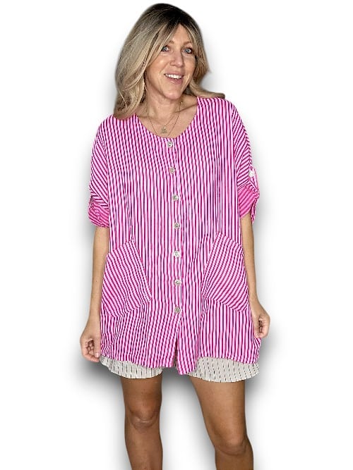 Hot Pink Plain Linen Tee with Coconut Buttons