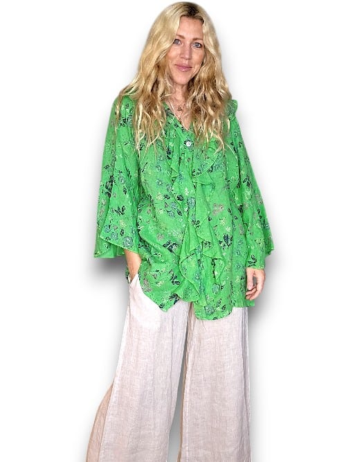 Bright Green Wild Garden Madrid Linen Frill Tunic