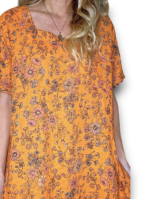 Orange Graphic Bloom Mid Sleeve Maxi Dress