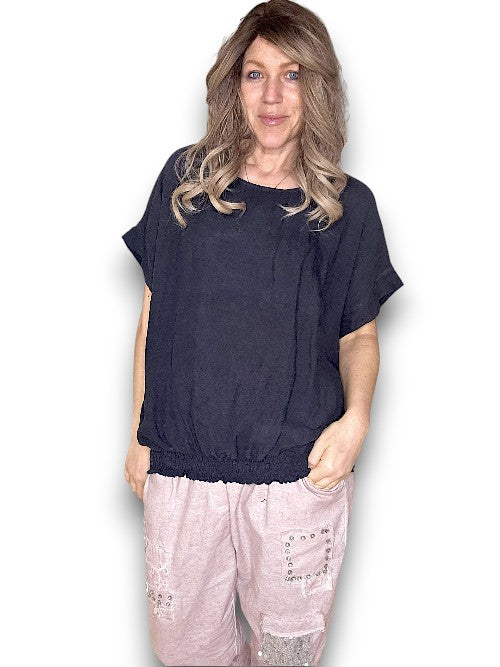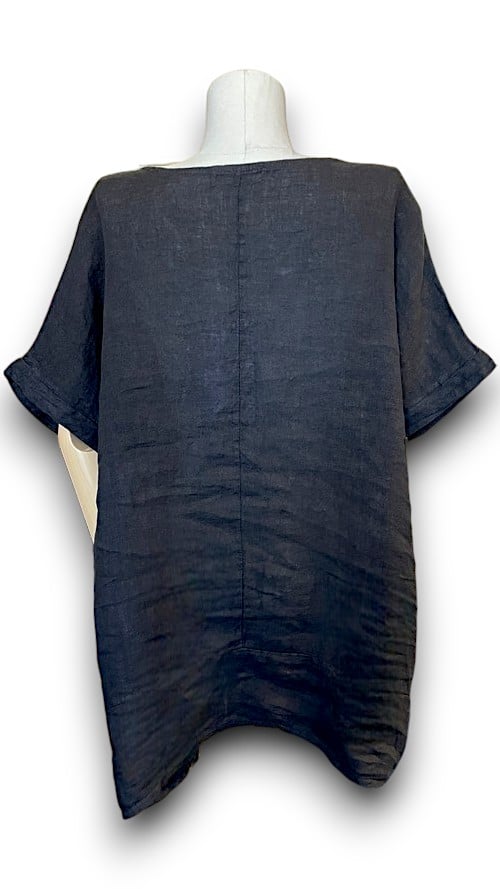 Black Plain Linen Tee with Coconut Buttons