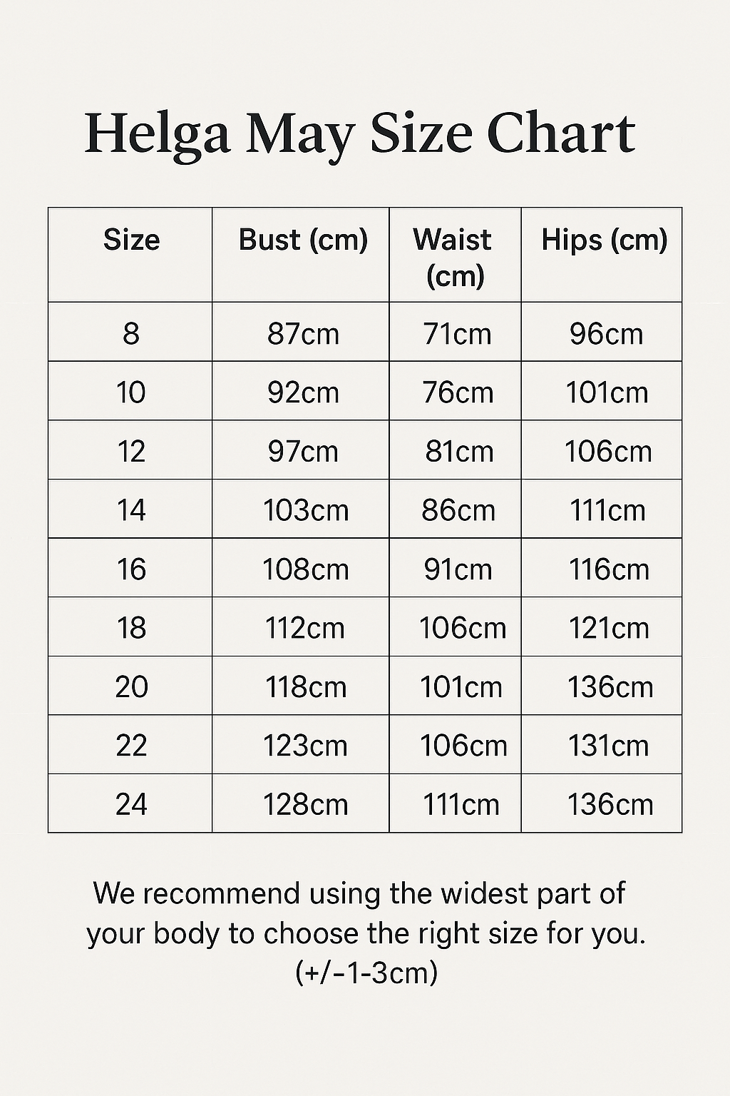 Our Helga May Outlet store — located at our warehouse and open Tuesday to Saturday (10am–3pm) — is run as a separate business. It offers last season’s styles and factory B’s, but please note it operates independently from this website.