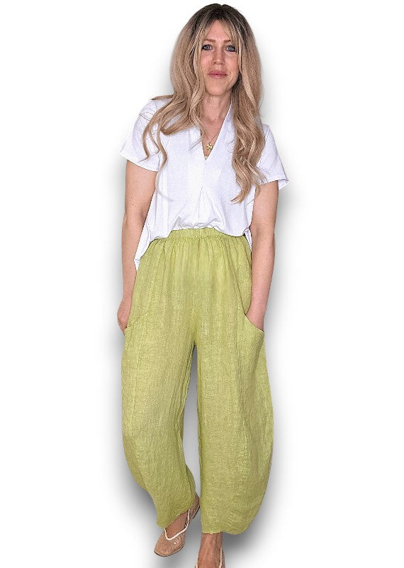 Wide and super comfortable Linen Pants with soft linen elastic waist featuring front outer pockets, Larger Free-Sizing. *Hand dyed so imperfections are part of the garment’s look*