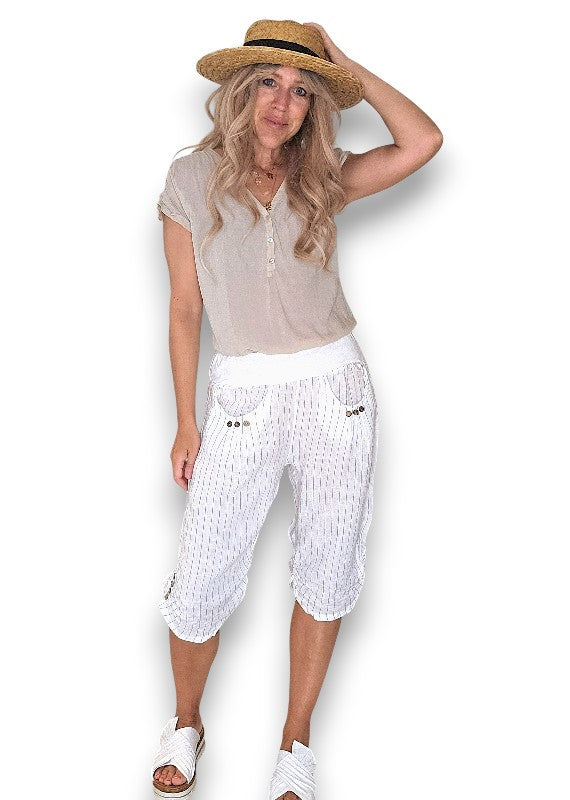 White Pinstripe Capri Linen Pant