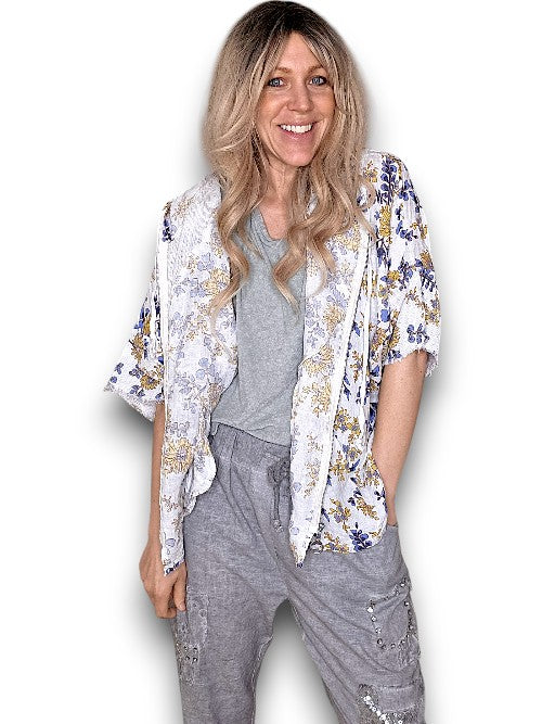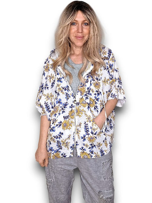 Free Sized. Composition: 100% Linen & Cotton ripped edge sleeve ends and shoulders. Made in Italy *Linen garments are hand dyed & printed. Imperfections may occur and is expected as part of the look*